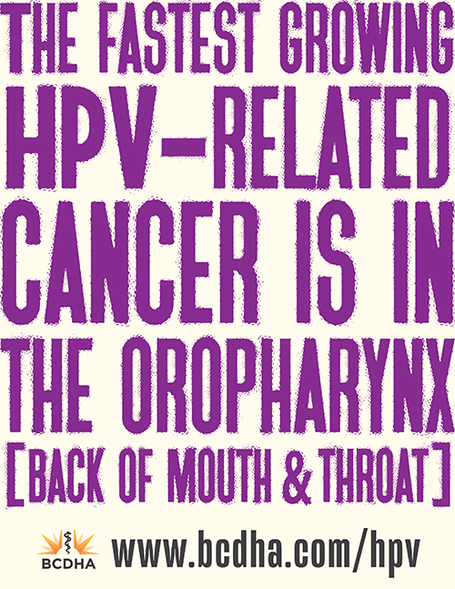 Human Papillomavirus Detection and PreventionAs part of our effort to support the ‘call to action’ by the Chief Dental Officer of Canada and the recent announcement by Health Canada to expand the recommendation of the HPV vaccination to prevent oral/oropharyngeal HPV infection and HPV-related oropharyngeal cancers.